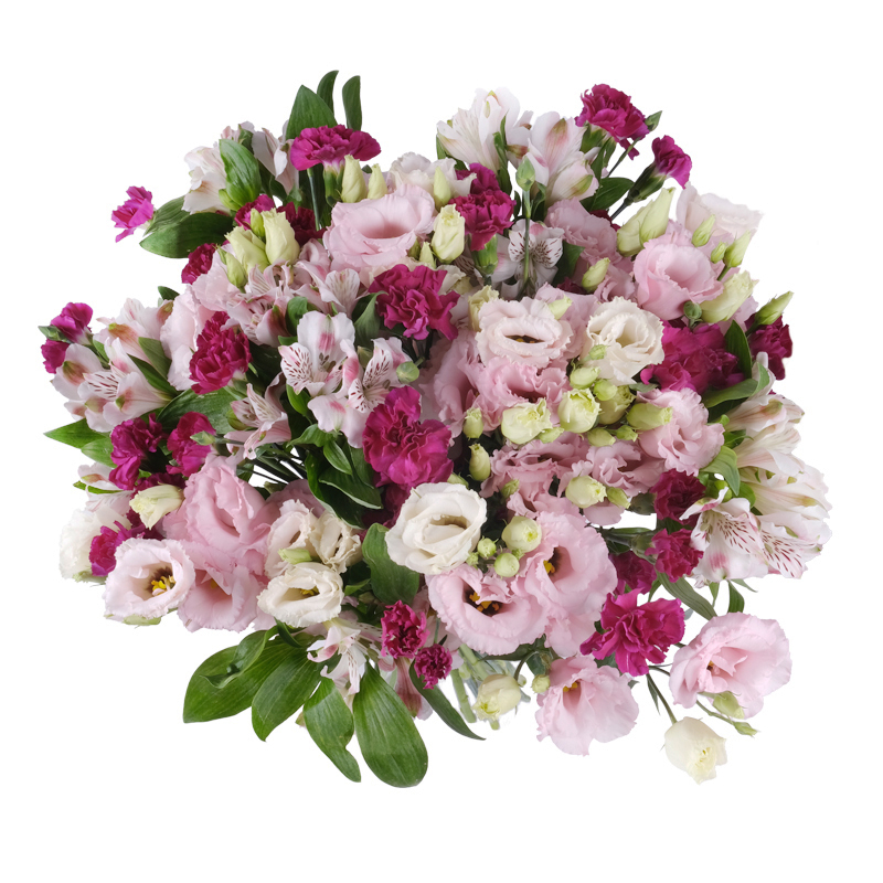 Skład bukietu Miłosny List to eustoma, alstromeria i goździk – każde z nich ma swoją rolę w tej kwiatowej historii. Bilecik, który możesz dodać, uczyni przekaz kompletnym.
